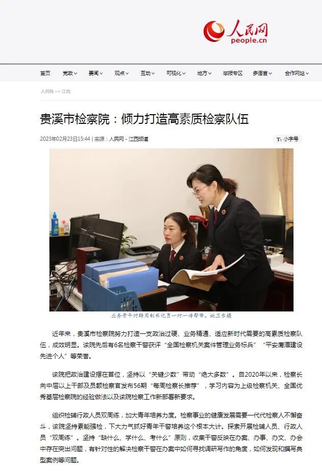 近年来,贵溪市检察院努力打造一支政治过硬、业务精通、适应新时代需要的高素质检察队伍,成效明显。该院先后有6名检察干警获评“全国检察机关案件管理业务标兵”“平安鹰潭建设先进个人”等荣誉。