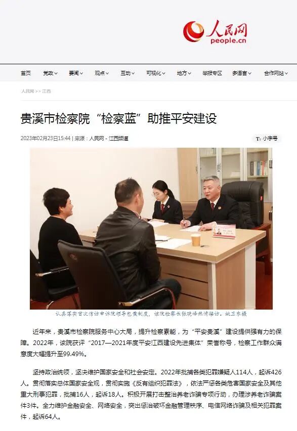 近年来,贵溪市检察院服务中心大局,提升检察素能,为“平安贵溪”建设提供强有力的保障。2022年,该院获评“2017—2021年度平安江西建设先进集体”荣誉称号,检察工作群众满意度大幅提升至99.49%。