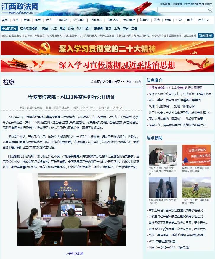 2022年以来,贵溪市检察院认真落实最高人民检察院“应听尽听”的工作要求,对所办111件案件组织召开了公开听证会,其中:2件听证案例入选全省检察机关典型案例。尤其是成功办理了全省检察机关首例通过互联网直播检察听证案件,检察听证工作以公开促公正赢公信,取得了较好成效。